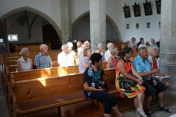 Frau Exl, eine der Mesnerinnen der Kirche, erklärt uns die Geschichte der Kirche, die baulichen Besonderheiten, die Orgel aus dem Jahr 1670 und betont, bezogen auf die Jetztzeit: