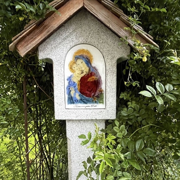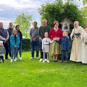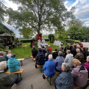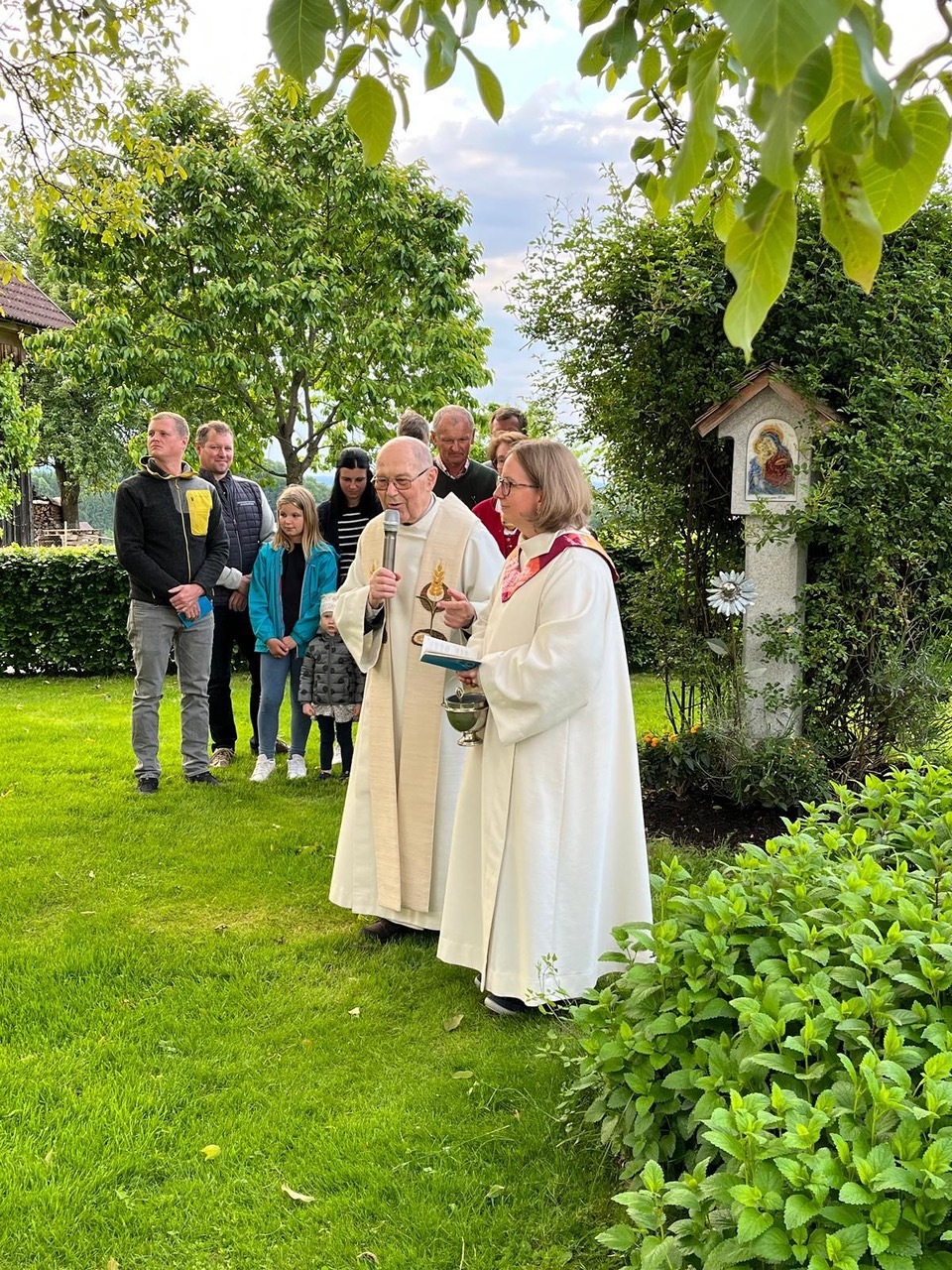 Eine große Anzahl von Freunden, Bekannten, Verwandten und Gemeindebürger/innen nahmen daran teil und marschierten den Rosenkranz betend über die Pfarrhofsiedlung in Richtung Moarhof zur Bildstock Segnung „Maria vom guten Rat" vor dem Bauernhof. Für den kirchlichen Teil der Maiandacht und Prozession waren Pfarrmoderatorin Anna Maria Marschner, Pfarrer Alois Kainberger und Ministranten dabei, musikalisch begleiteten Ingrid Burgtaller mit Tochter Barbara und Monika Weissmann die Feierstunde. Die Goldhauben,- Hut,- und Kopftuchgruppe Gschwandt verköstigten anschließend die vielen Teilnehmer/innen mit Getränke, Würstel und köstlichen, frischen Bauernkrapfen.