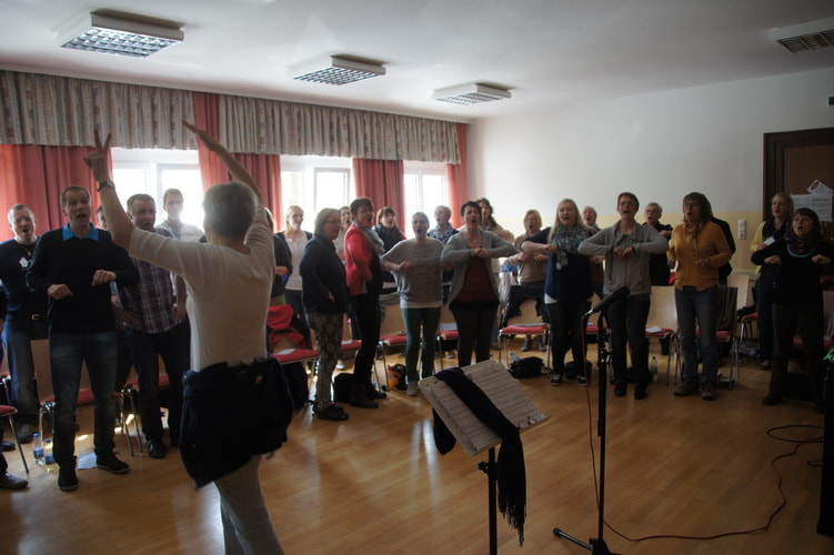In humorvoller und professioneller Weise lernte uns Angelika Rehaag Schritt für Schritt die Gospelstücke ein – ohne Noten, denn so konnten wir noch viel freier singen. Von den verschiedensten Einsingübungen bis hin zu zahlreichen Singtechniken leitete sie uns durch das Wochenende und schaffte es, den gesamten Chor mit ihrer Energie anzustecken.